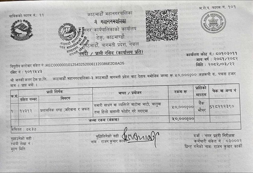 महानगरले जानकी कलर टेकलाई काठमाडौँ महानगरपालिका वडा नम्बर ३ स्थित गाडी वा व्यक्तिबाट सडकमा माटो, बालुवा तथा हिलो खसाली फोहोर गरेको भन्दै आइतबार ५० हजार रुपैयाँ जरिवाना तिराएको हो ।