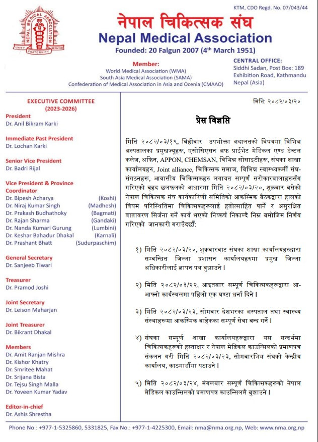 नेपाल चिकित्सक संघको आह्वानमा भएको यो आन्दोलनमा नौवटा स्वास्थ्य संस्थाले ऐक्यवद्धता जनाएका छन् ।