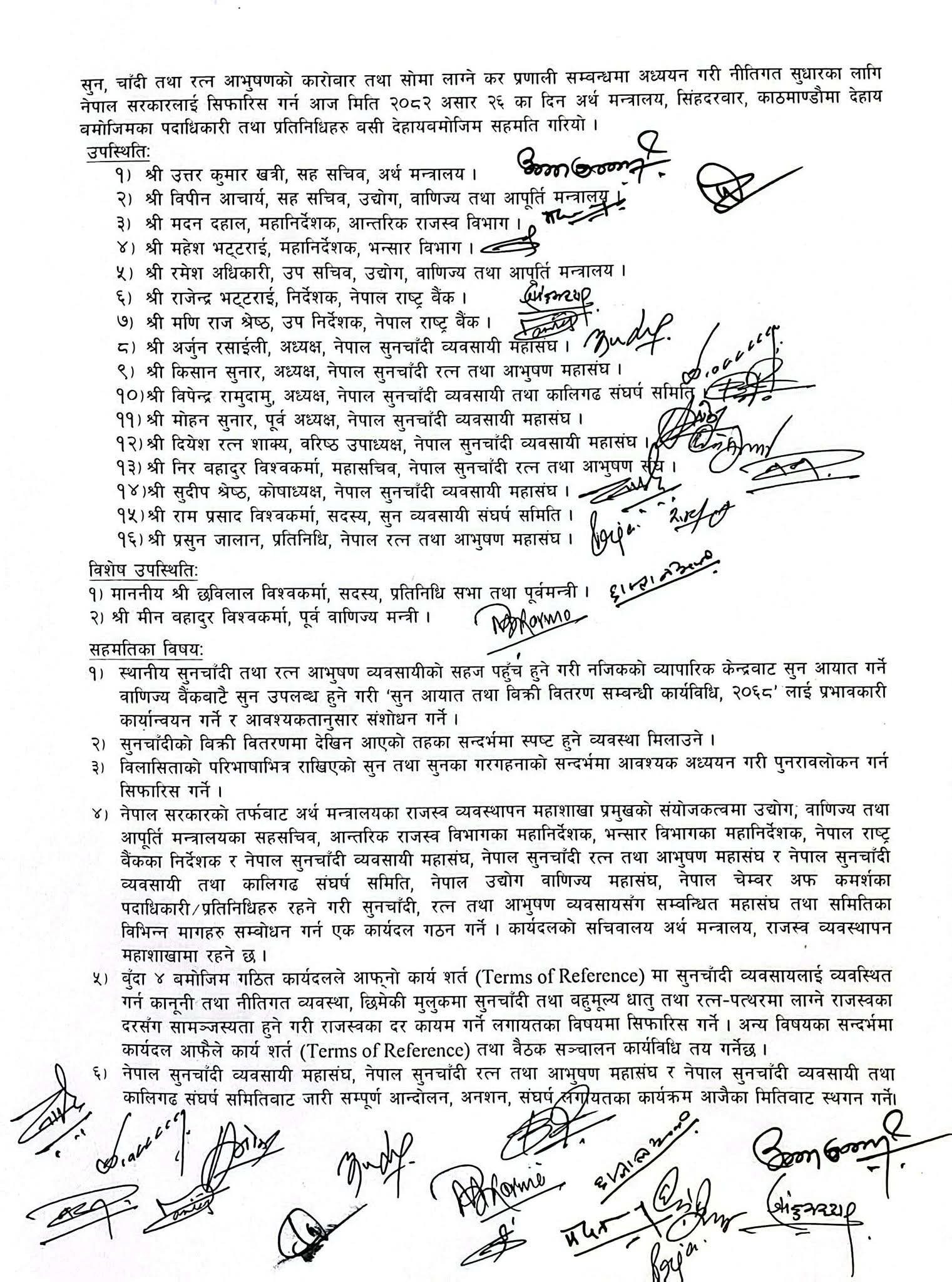 बिहीबार अर्थ मन्त्रालयमा भएको वार्तामा विलासिताको परिभाषाभित्र राखिएको सुन तथा सुनका गरगहनाको विषयमा आवश्यक अध्ययन गरी पुनरावलोकन गर्न सिफारिस गरिने सहमति भएको छ ।