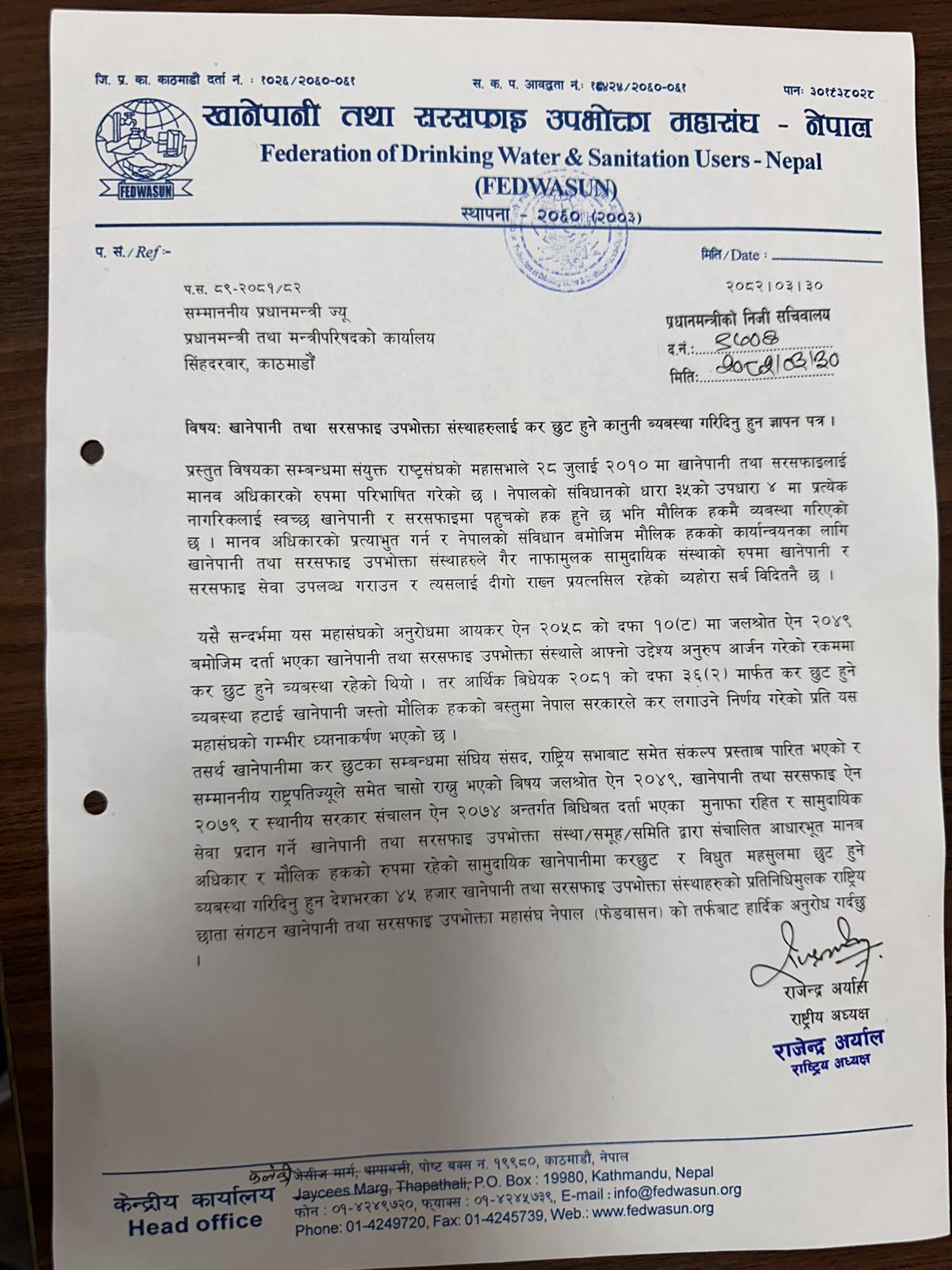 सोमबार देशभरका जिल्ला प्रशासन कार्यालय र मुख्य मन्त्री कार्यालय मार्फत प्रधानमन्त्रीलाई ज्ञापनपत्र बुझाए पछि खानेपानी तथा सरसफाइ उपभोक्ता महासंघ (फेडवासन) को राष्ट्रिय कार्यालयद्वारा जारी विज्ञप्तीमा खानेपानी उपभोक्ता संस्थाहरु माथि लगाएको अव्यहारिक कर तत्काल खारेज गर्नुपर्ने र बेवास्ता गरेमा चरणबद्ध आन्दोलनमा उत्रने चेतावनी दिएको हो ।