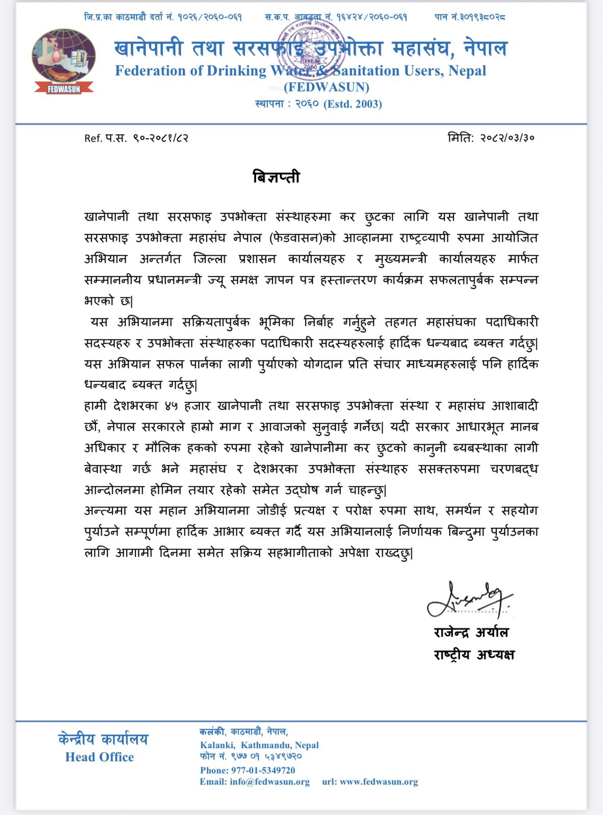 खानेपानी तथा सरसफाइ उपभोक्ता महासंघ नेपाल (फेडवासन) को आह्वानमा सोमबार खानेपानी तथा सरसफाइ उपभोक्ता जिल्ला महासंघले प्रमुख जिल्ला अधिकारी मार्फत र प्रदेश महासंघले मुख्य मन्त्री मार्फत प्रधानमन्त्री समक्ष ज्ञापन पत्र पठाईएको थियो भने फेडवासनका राष्ट्रिय अध्यक्ष राजेन्द्र अर्याल नेतृत्वको टोली प्रधानमन्त्री तथा मन्त्रीपरिषदको कार्यालयमा ज्ञापन पत्र पेश गरेको थियो ।