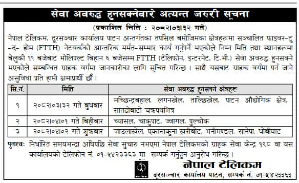 ललितपुरको पाटन क्षेत्रका विभिन्न स्थानमा तीन रात टेलिफोन तथा इन्टरनेट सेवा अवरुद्ध हुने भएको छ ।