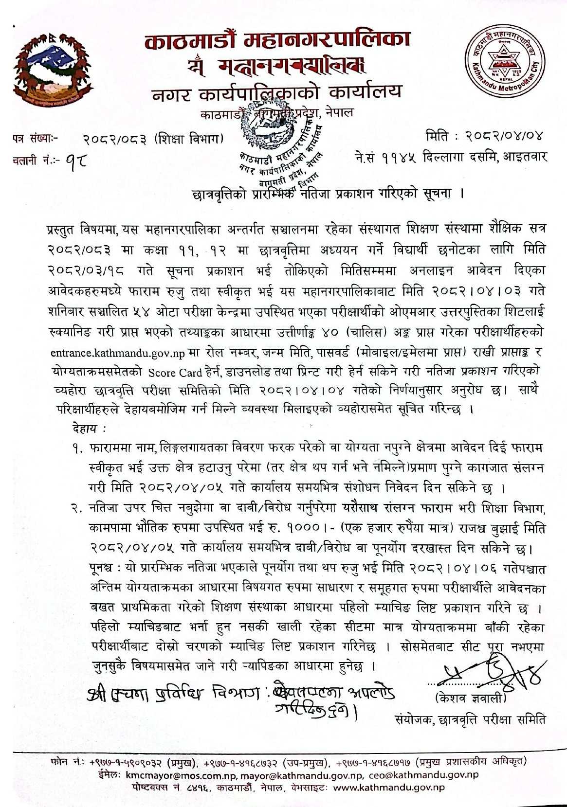 काठमाडौं महानगरपालिकाले कक्षा ११ र १२ मा संस्थागत शिक्षण संस्थामा छात्रवृत्ति कोटामा अध्ययन गर्न इच्छुक विद्यार्थीका लागि सञ्चालन गरिएको प्रवेश परीक्षाको नतिजा प्रकाशित गरेको छ ।