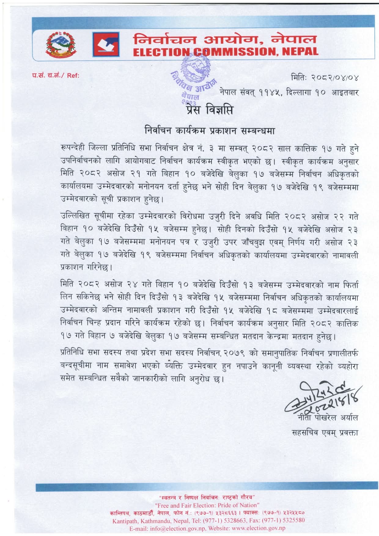 उनका अनुसार, असोज ११ गते बिहान १० बजेबाट निर्वाचन कार्यक्रम सुरु हुनेछ । सो दिन बेलुकी ५ बजेसम्म उम्मेदवारको मनोनयन दर्ता हुने कार्यक्रम स्वीकृत भएको आयोगले जनाएको छ ।