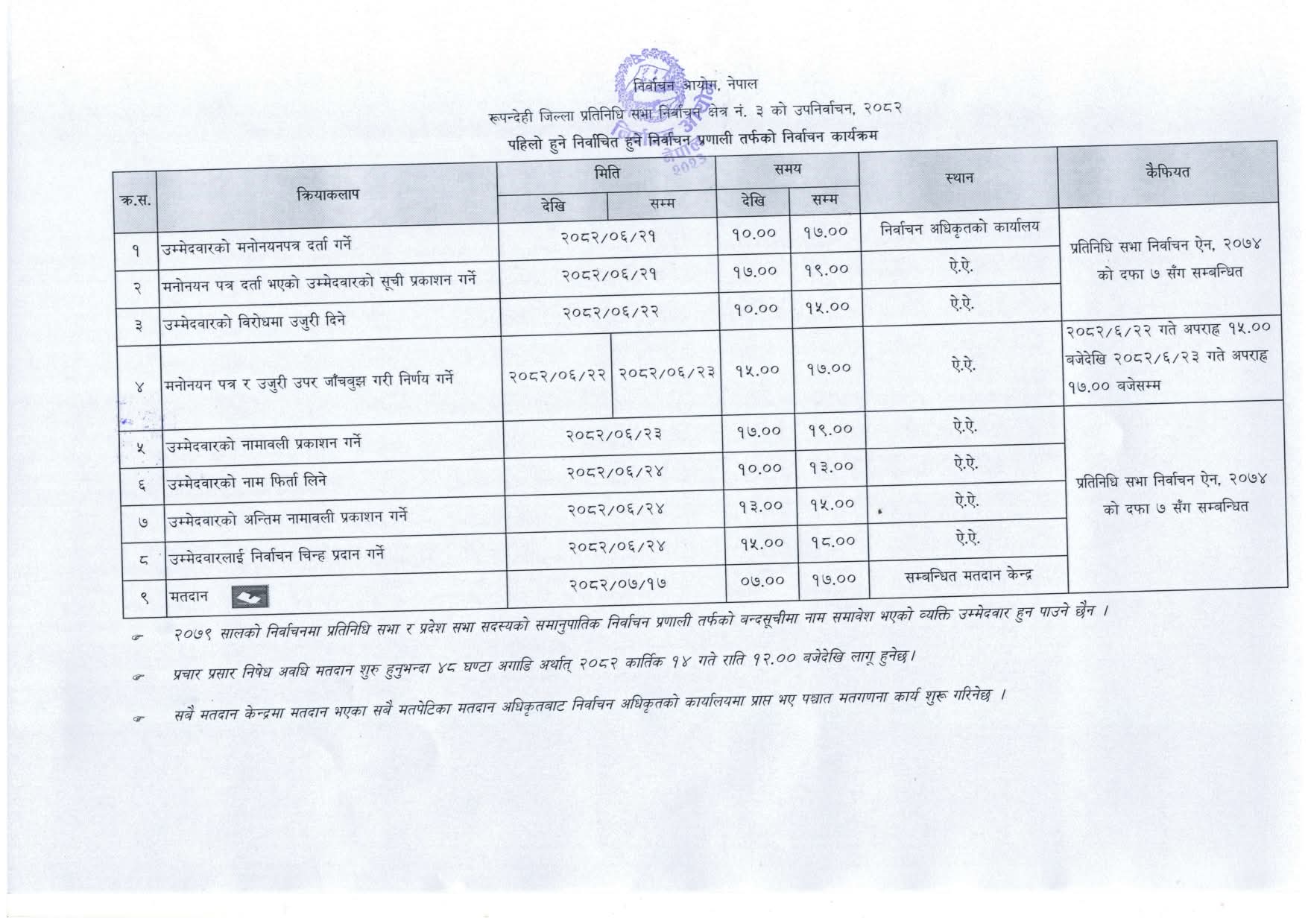 त्यस्तै, असोज २३ गते बेलुकी ५ देखि ७ बजेसम्मा उम्मेदवारको नामावली प्रकाशन हुनेछ ।