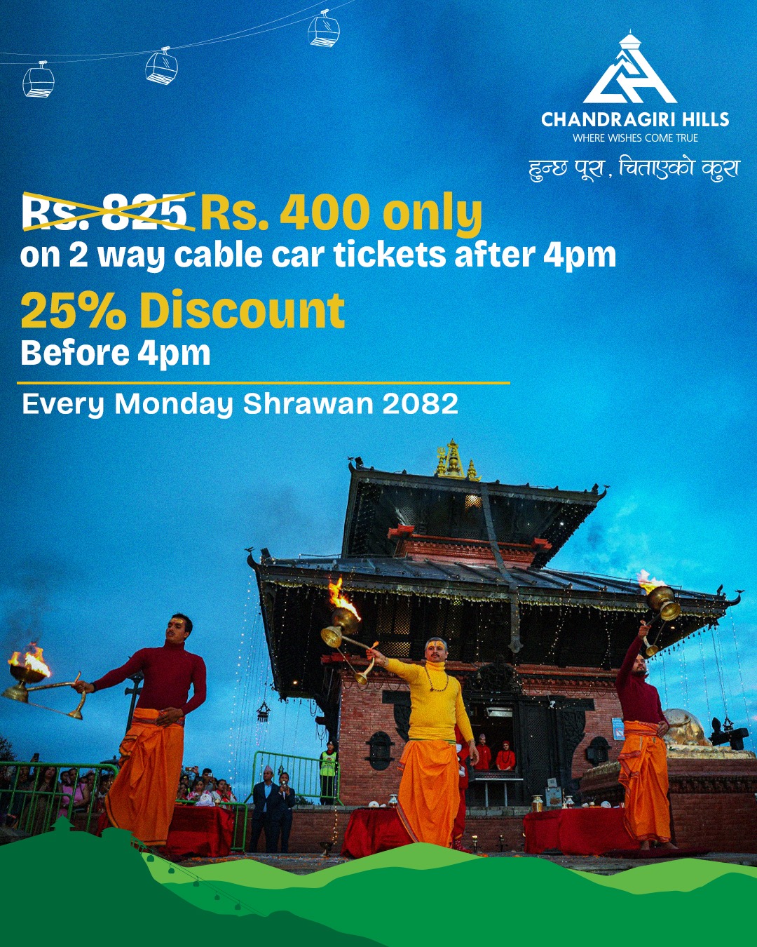 जसअनुसार साउन महिनाको प्रत्येक सोमबार साँझ ४ बजेपछिको केबलकारको टिकटमा ४ सय रुपैयाँमै उपलब्ध हुनेछ ।