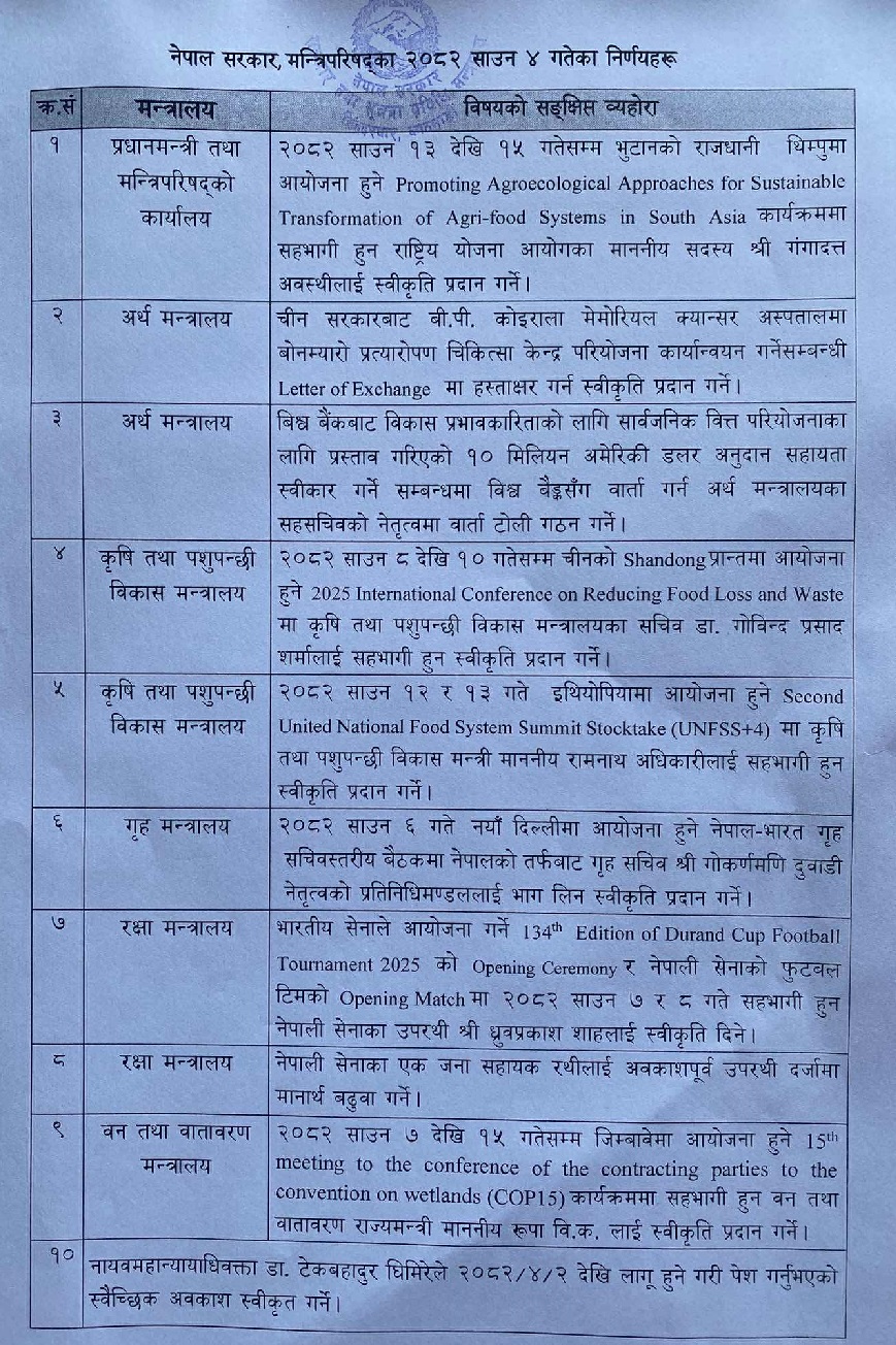 साउन ४ गते बसेको मन्त्रिपरिषद् बैठकमा भएका १० निर्णय सार्वजनिक
