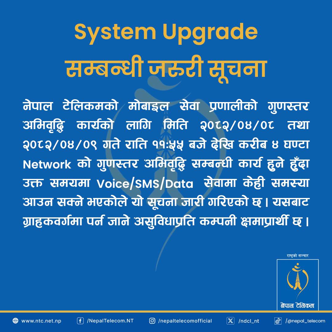 नेपाल टेलिकमले आज र भोली राती आफ्नो सिस्टम अपग्रेड गर्दै नेटवर्कको गुणस्तर अभिवृद्धि गर्ने भएको छ।