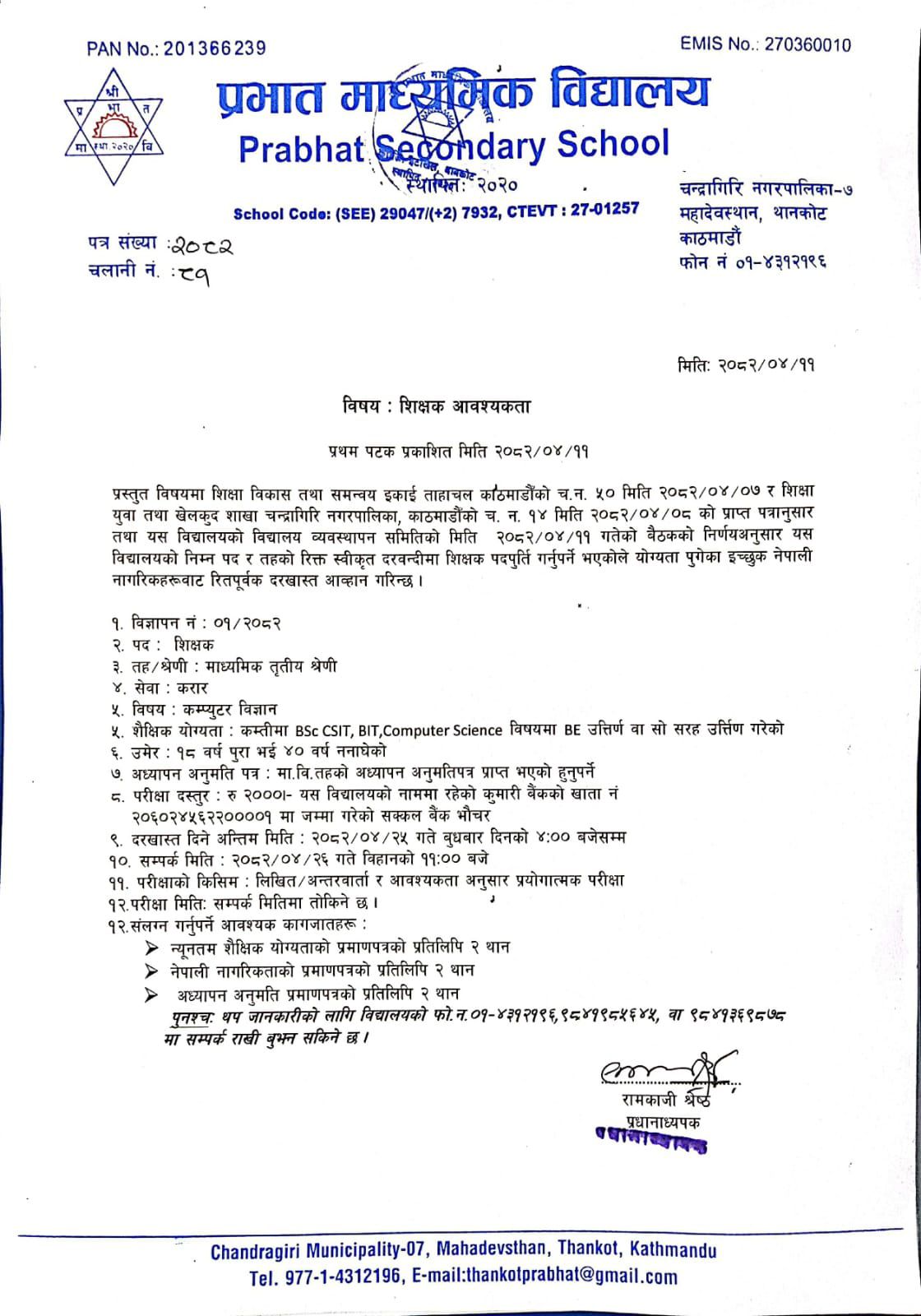 थानकोट चेकपोष्टस्थित प्रभात माविले कम्प्युटर विज्ञान शिक्षण शिक्षक माग गरेको छ ।