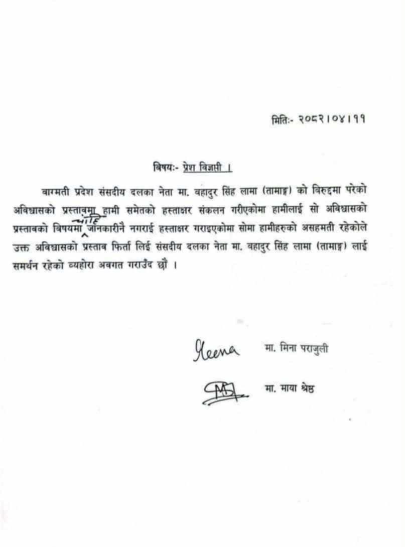 आफ्नै दल नेपाली कांग्रेसका बागमती प्रदेश संसदीय दलका नेता रहेका मुख्यमन्त्री लामाविरुद्ध गत शुक्रबार संसद्मा पेस अविश्वास प्रस्तावबारे आफूहरूलाई थाहै नदिई हस्ताक्षर गराइएको दाबी गर्दै सांसदद्वय माया श्रेष्ठ र मीना पराजुलीले त्यसबाट आफूहरू नाम फिर्ता लिइएको घोषणा गरेका हुन्।