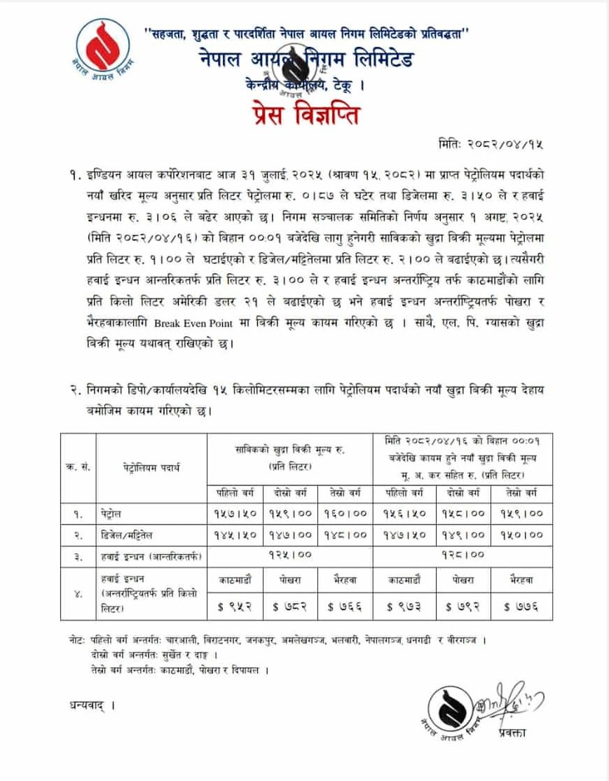 नेपाल आयल निगमले पेट्रोलको मूल्य घटाएको छ भने डिजेल र मट्टीतेलको मूल्य बढाएको छ ।