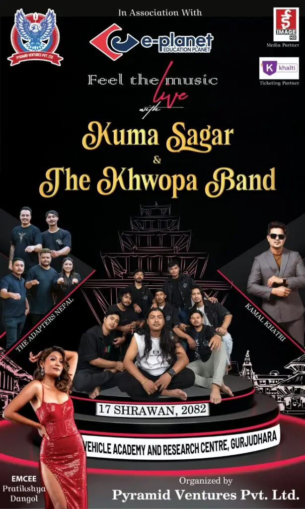 ‘कुमा सागर एण्ड द ख्वपः ब्यान्ड’ को सांगीतिक कार्यक्रम फिल दी म्यूजिक लाइभ वीथ कुमा सागर एण्ड दी ख्वप शनिबार गुर्जुधारास्थित भेहिकल एकेडेमी एण्ड रिसर्च सेन्टरमा आयोजना हुन लागेको हो ।