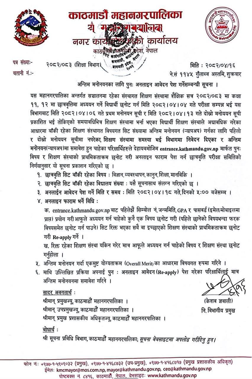 काठमाडौँ महानगरपालिकाले शैक्षिक सत्र २०८२–०८३ का लागि कक्षा ११ र १२ को छात्रवृत्तिमा रिक्त रहेका सिटहरूमा भर्नाका लागि पुनः आह्वान गरेको छ।