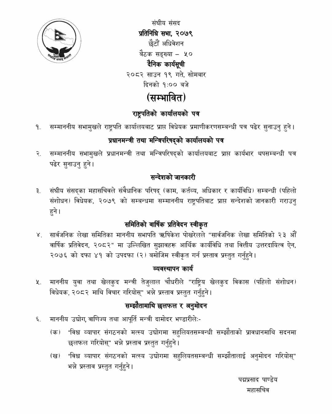 साथै, संघीय संसदका महासिचवले संजैधानिक परिषद् (काम, कर्तव्य, अधिकार र कार्यविधि) सम्बन्धी (पहिलो संसोधन) विधेयक, २०७९ राष्ट्रपतिबाट प्राप्त सन्देशको जानकारी दिनेछन् भने सार्वजनिक लेखा समितिको २३ औं वार्षिक प्रतिवेदन, २०८२ मा उल्लेखित आर्थिक कार्यविधि तथा वित्तिय उत्तरदायित्व ऐन, स्वीकृत गर्न प्रस्ताव प्रस्तुत हुनेछ ।