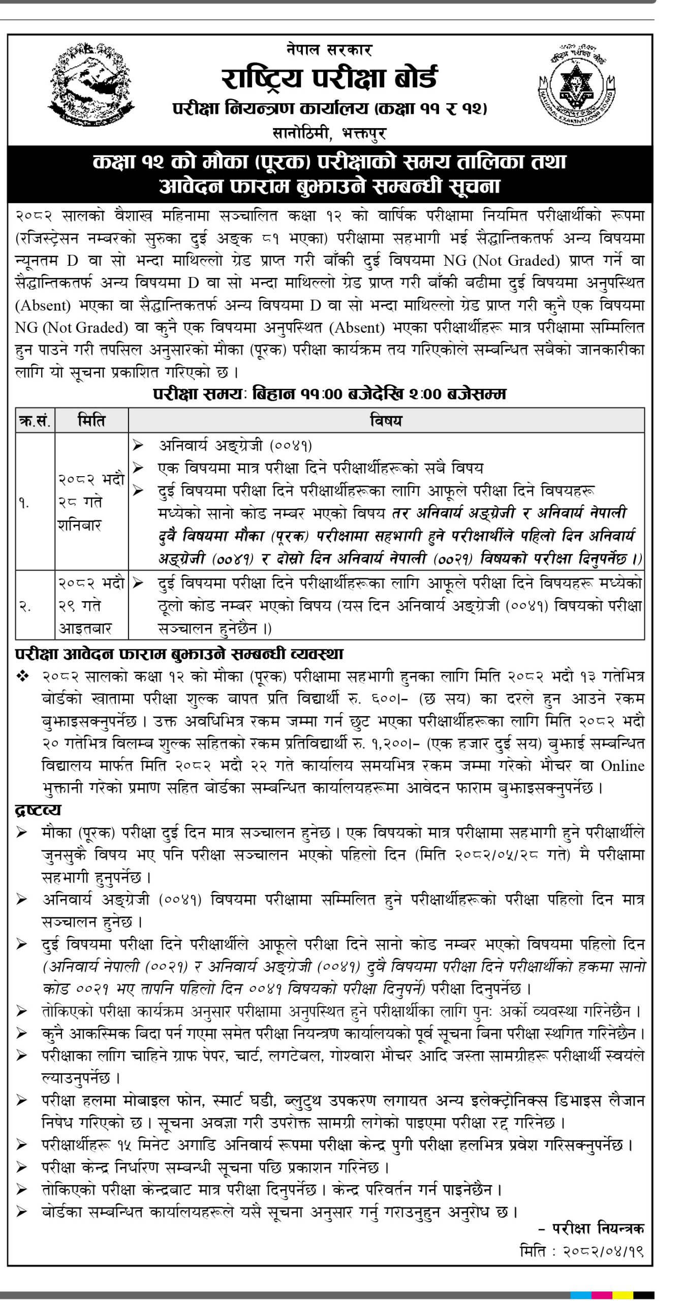 राष्ट्रिय परीक्षा बोर्ड, परीक्षा नियन्त्रण कार्यालय (कक्षा ११ र १२), सानोठिमी, भक्तपुरले कक्षा १२ को मौका (पूरक) परीक्षाको समयतालिका तथा आवेदन फारम बुझाउने सम्बन्धमा सूचना प्रकाशित गरेको छ।