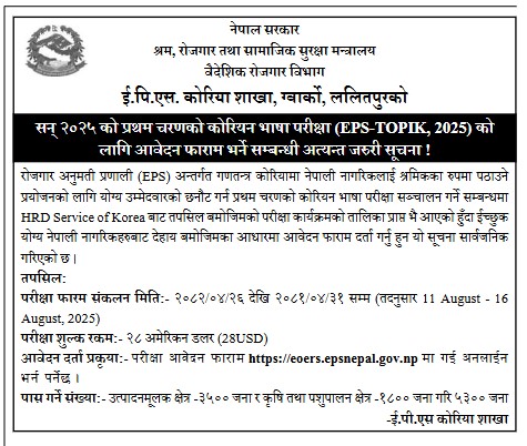 श्रम, रोजगार तथा सामाजिक सुरक्षा मन्त्रालय अन्तर्गतको वैदेशिक रोजगार विभाग, ई.पि.एस. कोरिया शाखाले सन् २०२५ को प्रथम चरणको कोरियन भाषा परीक्षाका लागि आवेदन खुला गरेको छ।