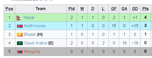 प्रतियोगिताको पहिलो खेलमा नेपालले घरेलु टोली भूटानसँग १–१ गोलको बराबरी खेलेको थियो । अब नेपालले समूह चरणको अन्तिम खेलमा आइतबार बलियो टोली उत्तर कोरियासँग खेल्नेछ ।