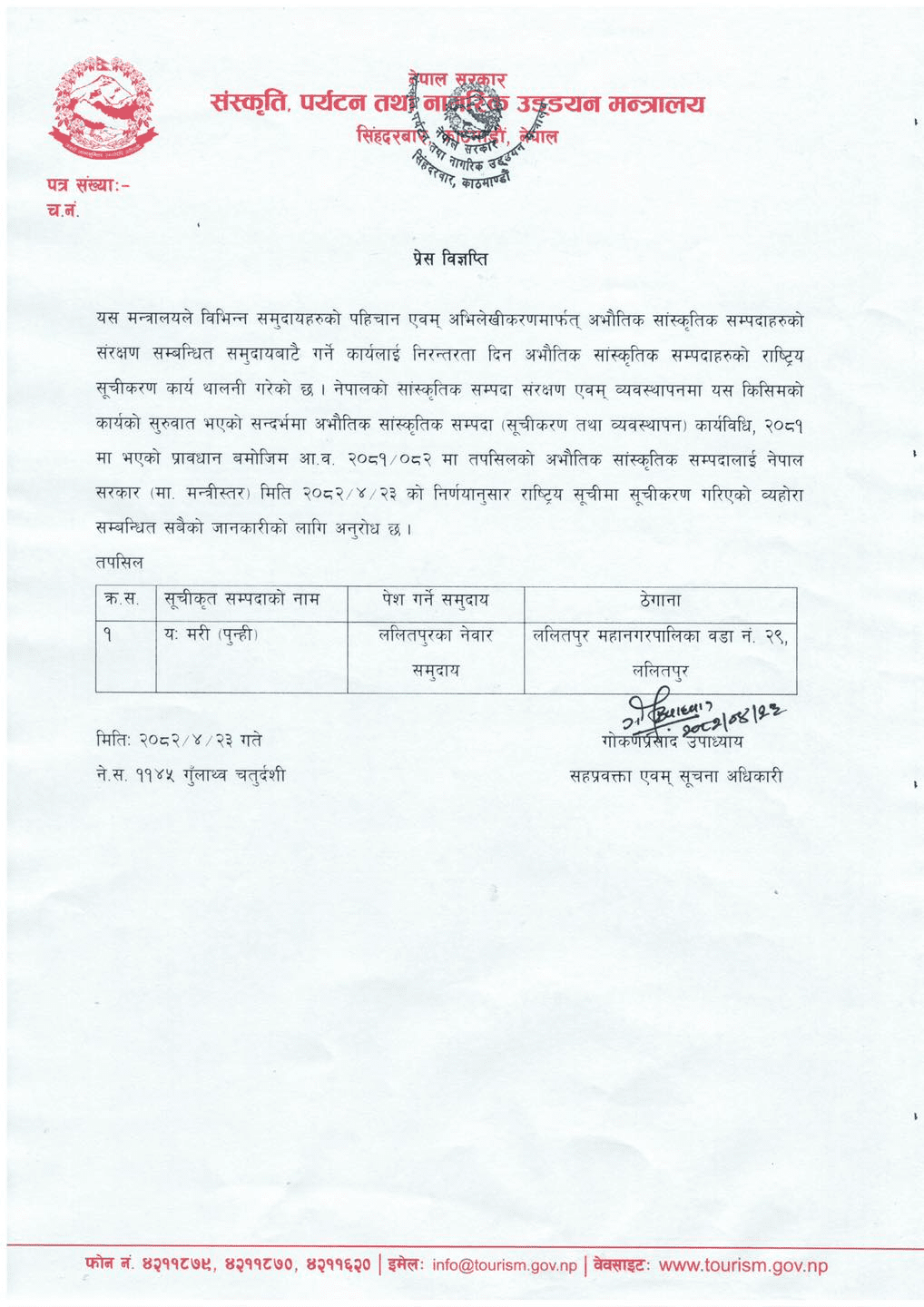 मन्त्रालयका सह प्रवक्ता तथा सूचना अधिकारी गोकर्णप्रसाद उपाध्यायद्वारा जारी विज्ञप्तिअनुसार, नेपाल सरकारको साउन २३ गतेको मन्त्रीस्तरीय निर्णयबाट यो घोषणा गरिएको हो । ललितपुरका नेवार समुदायले गरेको प्रस्तावका आधारमा यःमरीलाई अमूर्त सांस्कृतिक सम्पदाको रूपमा सूचीकृत गरिएको हो ।