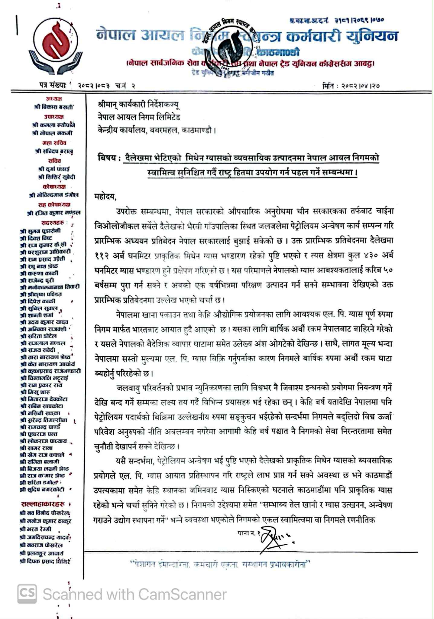 निगम अन्तर्गतको स्वतन्त्र कर्मचारी युनियनले निगमका कार्यकारी निर्देशक चण्डिकाप्रसाद भट्टलाई मंगलबार ७ बुँदे ज्ञापनपत्र बुझाएर निगमबाटै ग्यास उत्खनन र बजारीकरणको सुनिश्चितता गर्न आग्रह गरेका हुन्।