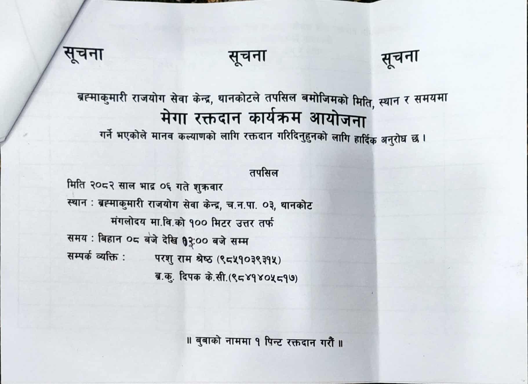 ब्रह्माकुमारी राजयोग सेवा केन्द्र थानकोट शाखामा यही भदाै ६ गते थानकोटमा रक्तदान शिविर सञ्चालन गर्न लागेको हो ।