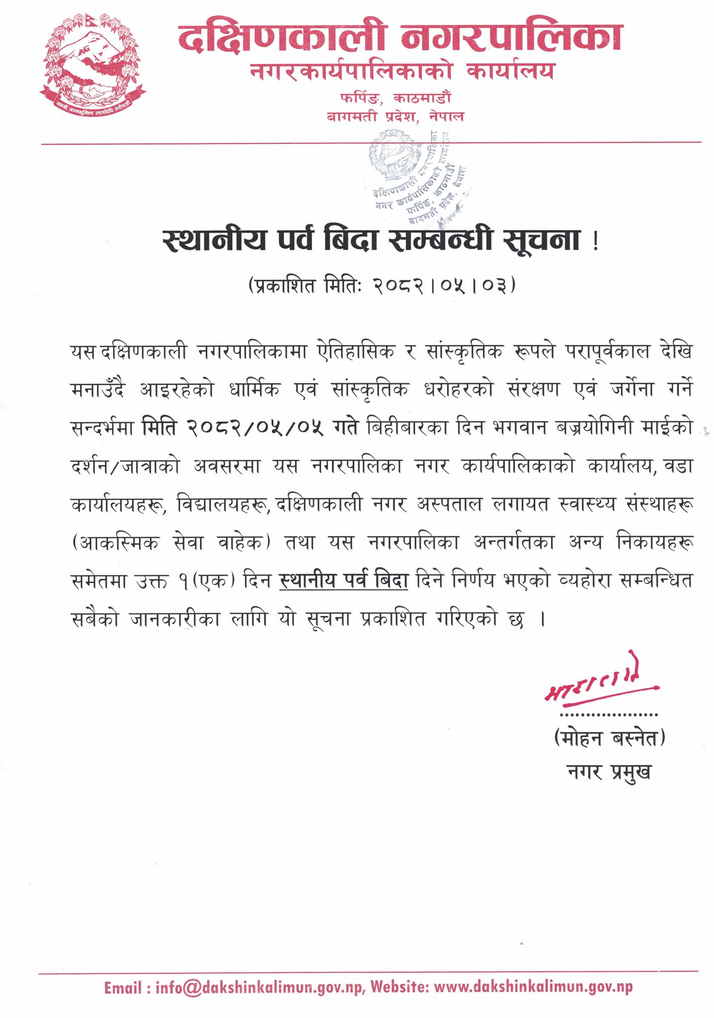 भोलि (भदाै ५ गते) दक्षिणकाली नगरमा स्थानीय बिदा