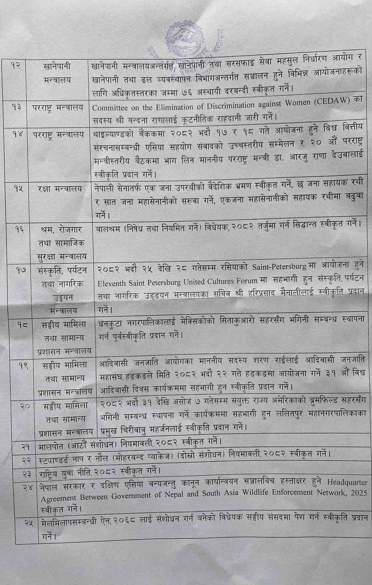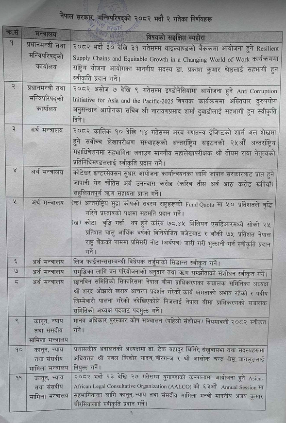 भदौ २ गते बसेको मन्त्रिपरिषद्का बैठकका निर्णय सार्वजनिक (सूचीसहित)