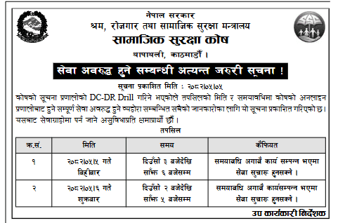सामाजिक सुरक्षा कोषले आफ्नो अनलाइन प्रणालीबाट प्रदान हुने सम्पूर्ण सेवाहरू दुई दिन अवरुद्ध हुने जनाएको छ।