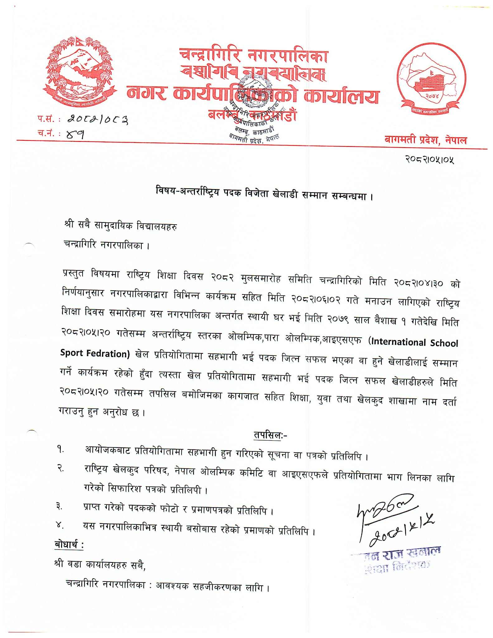 मिति २०७९ बैशाख १ यता २०८२ भदाै २० सम्म अन्तराष्ट्रिय स्तरका खेल उत्सवमा पदक जितेका खेलाडीहरूका लागि चन्द्रागिरि नगरले सम्मान गर्न लागेको एक सूचनामार्फत जानकारी दिएको हो ।