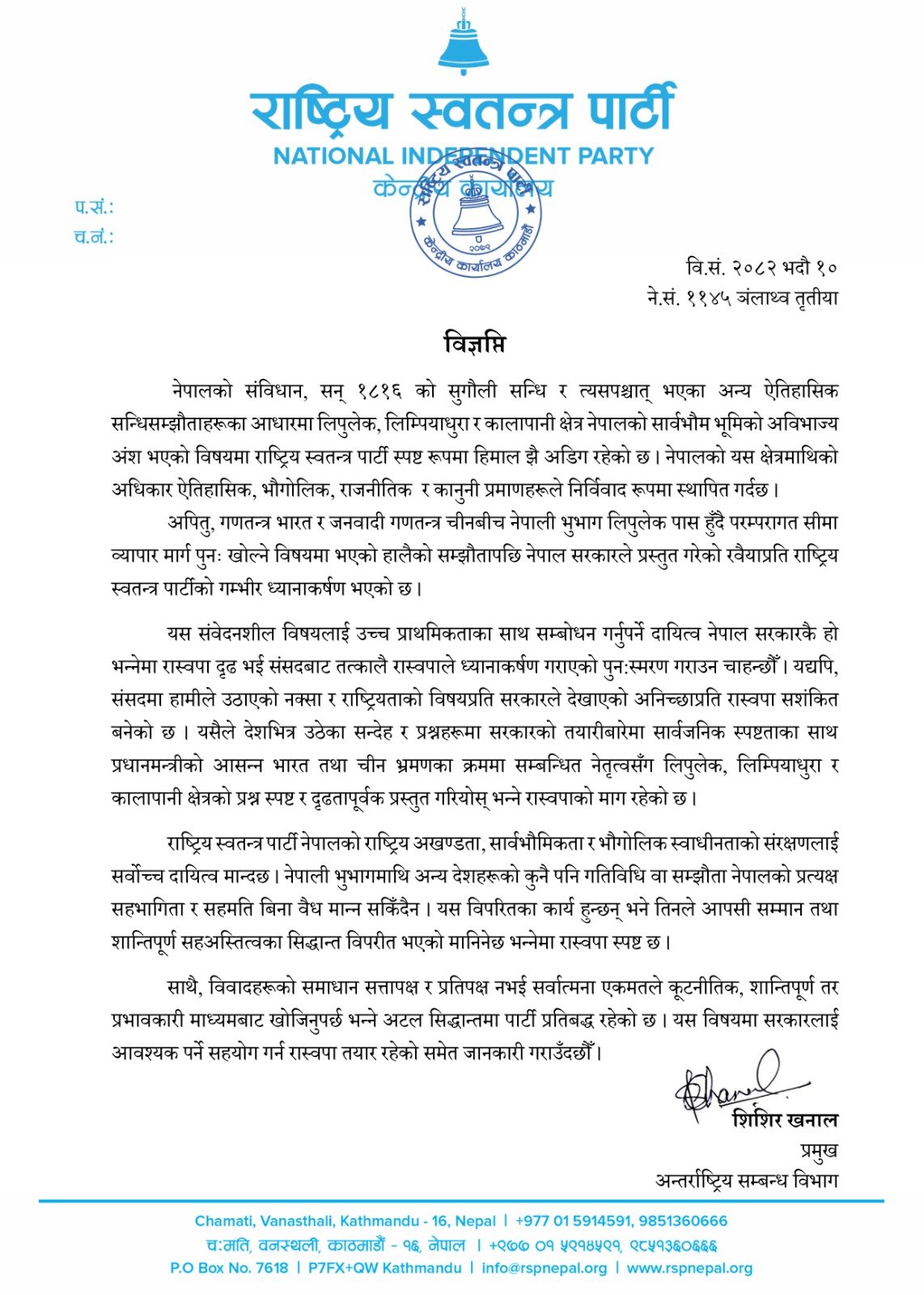 “भारत र चीनबीच नेपाली भूभाग लिपुलेक पास हुँदै परम्परागत सीमा व्यापार मार्ग पुनः खोल्ने विषयमा भएको हालैको सम्झौतापछि नेपाल सरकारले प्रस्तुत गरेको रवैयाप्रति राष्ट्रिय स्वतन्त्र पार्टीको गम्भीर ध्यानाकर्षण भएको छ,” रास्वपाले विज्ञप्ति जारी गर्दै भनेको छ, “रास्वपा राष्ट्रिय अखण्डता, सार्वभौमिकता र भौगोलिक स्वाधीनताको संरक्षणलाई सर्वोच्च दायित्व मान्दछ । यस विपरीतका कार्य हुन्छन् भने तिनले आपसी सम्मान तथा शान्तिपूर्ण सहअस्तित्वका सिद्धान्त विपरीत भएको मानिनेछ ।”