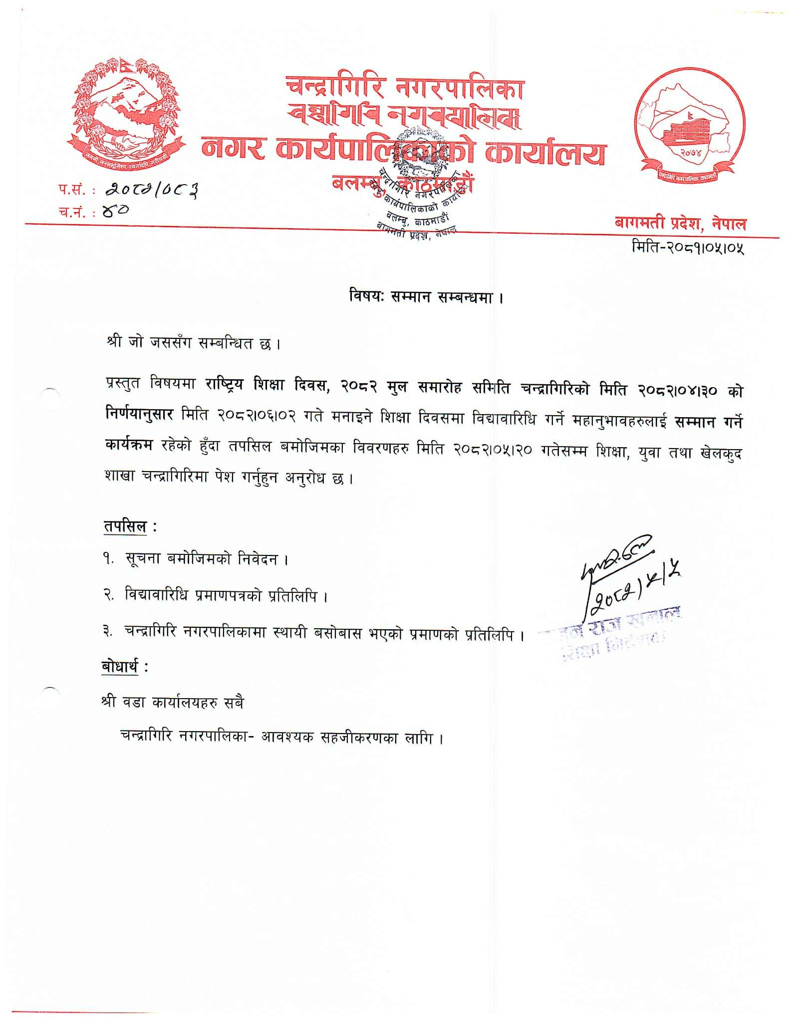 चन्द्रागिरि नगरपालिकाले नगर क्षेत्रमा स्थायी रूपमा बसोबास गर्दै आएका र विद्यावारिधि उपाधि हासिल गरेका नगरबासीलाई असोज २ गते मनाइने राष्ट्रिय शिक्षा दिवसका दिन सम्मान गर्न लागेको हो ।