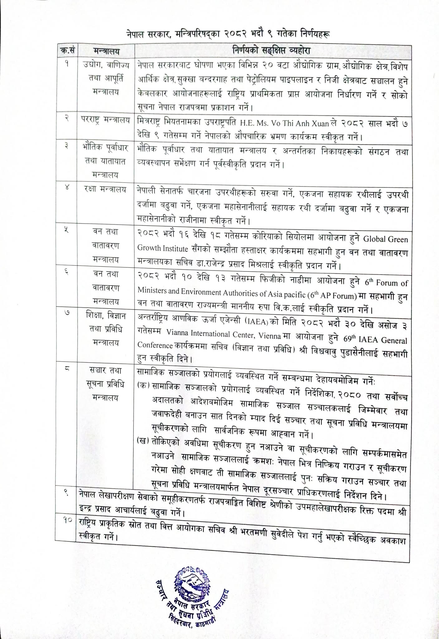 गत भदाै ९ गते सोमबार बसेको मन्त्रिपरिषद् बैठकका निर्णयहरू सार्वजनिक गरिएको छ ।