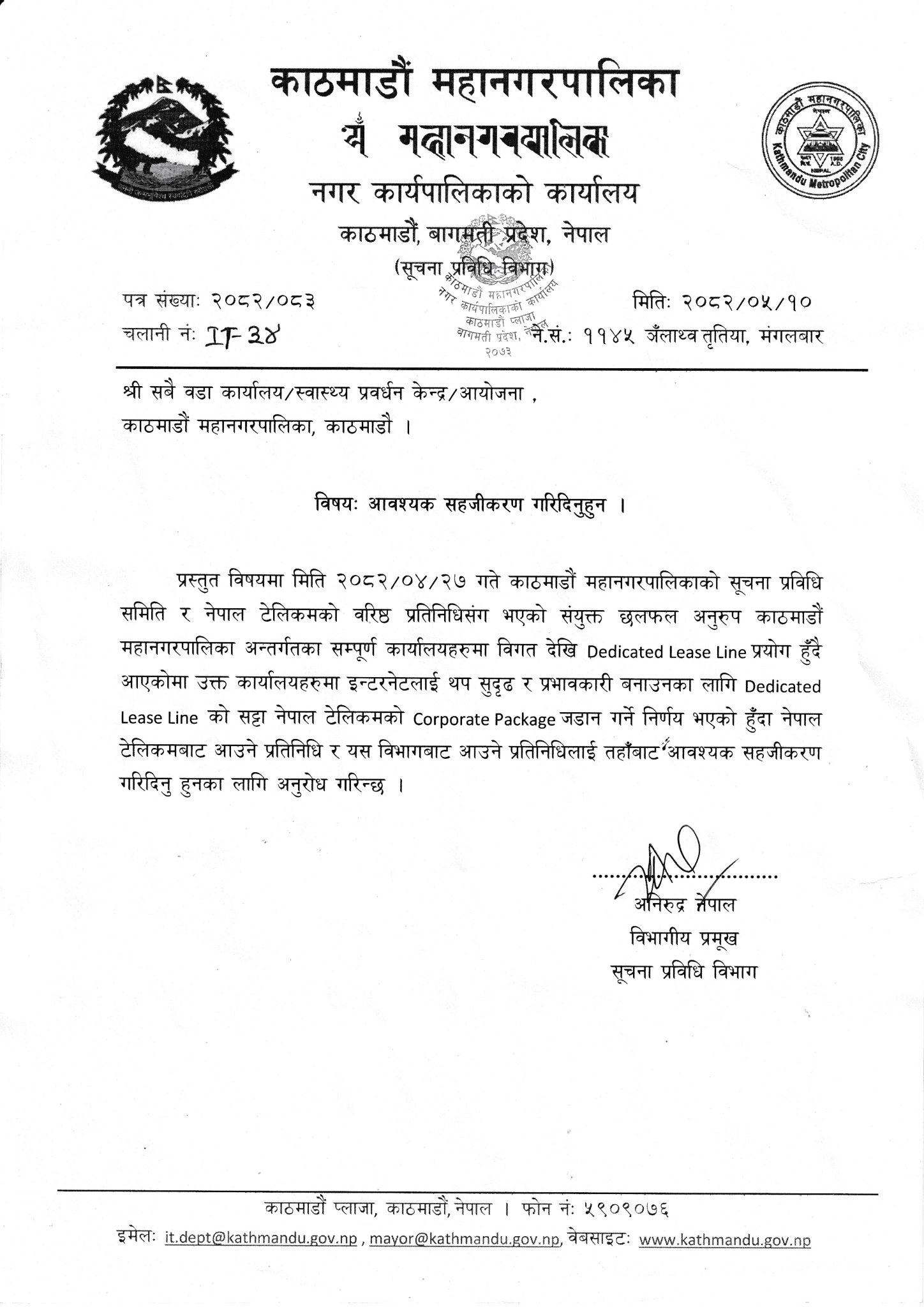 महानगरपालिकाले आफ्ना सबै वडा कार्यालय, स्वास्थ्य प्रवर्धन केन्द्र र आयोजना कार्यालयहरूलाई  कर्पोरेट प्याकेज जडान गर्न सहजीकरणको लागि पत्र पठाएको हो ।