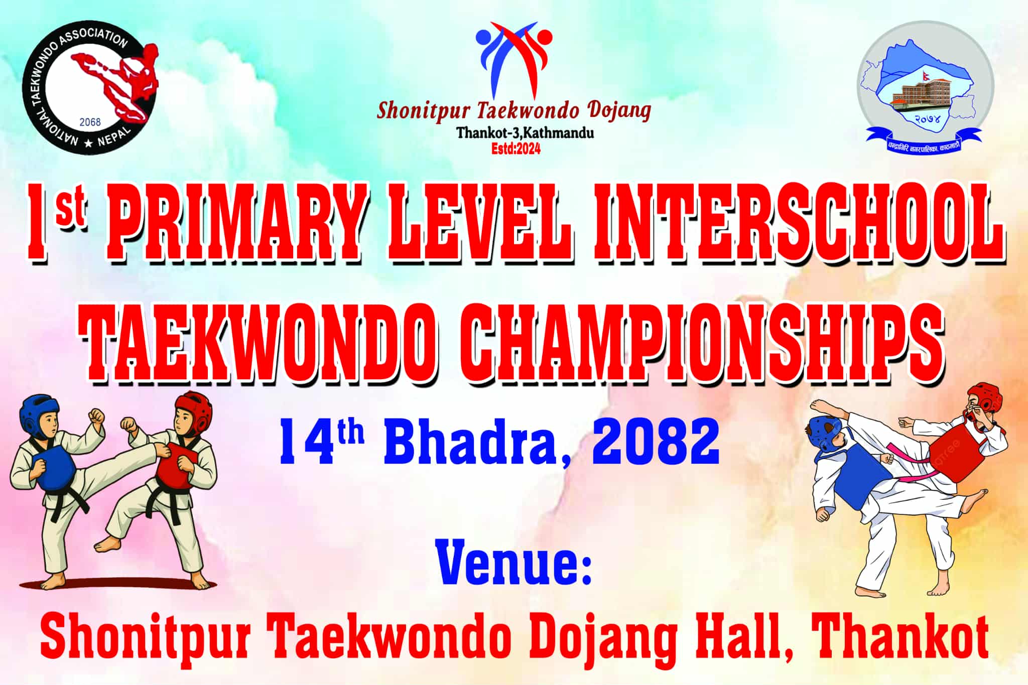 शोणितपुर तेक्वान्दो डोजाङको आयोजनामा थानकोटमा आज शनिबार प्रथम शोणितपुर आधारभूत तह अन्तर स्कुल तेक्वान्दो प्रतियोगिता सञ्चालन हुँदैछ ।