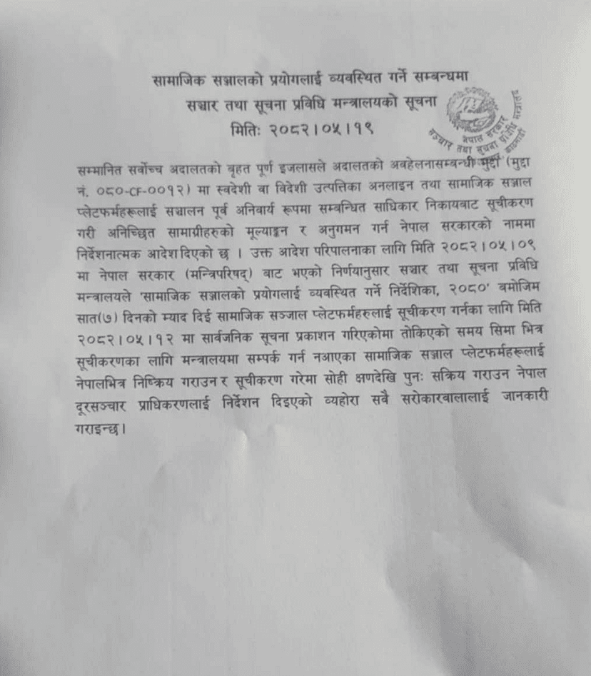 त्यसअघि भदौ ९ गते बसेको मन्त्रिपरिषद्को बैठकले तोकिएको अवधिभित्र सूचीकरण हुन नआउने वा सम्पर्कमा समेत नआउने सामाजिक सञ्जाललाई क्रमशः निष्क्रिय गराउन मन्त्रालयमार्फत् नेपाल दूरसञ्चार प्राधिकरणलाई निर्देशन दिने निर्णय गरेको थियो । मन्त्रिपरिषद्ले गरेको निर्णयकै व्यहोरामा सञ्चार मन्त्रालयको सूचना प्रकाशन भएको देखिन्छ ।