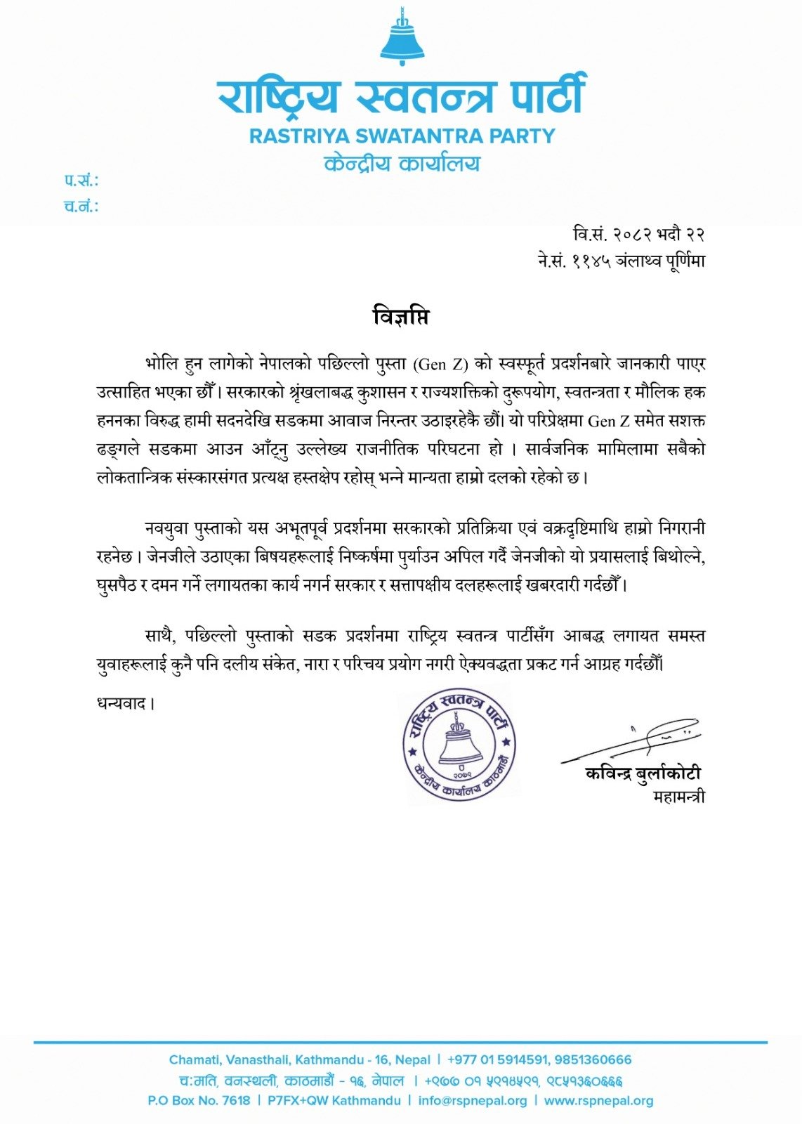 सरकारको शृङ्खलाबद्ध कुशासन र राज्यशक्तिको दुरुपयोग, स्वतन्त्रता र मौलिक हक हननका विरुद्ध हामी सदनदेखि सडकमा आवाज निरन्तर उठाइरहेकै छौँ। यो परिप्रेक्षमा जेनजी समेत सशक्त ढङ्गले सडकमा आउन आँट्नु उल्लेख्य राजनीतिक परिघटना हो,रास्वपा महामन्त्री कविन्द्र बुर्लाकोटीद्धारा हस्ताक्षरित विज्ञप्तिमा भनिएको छ ।