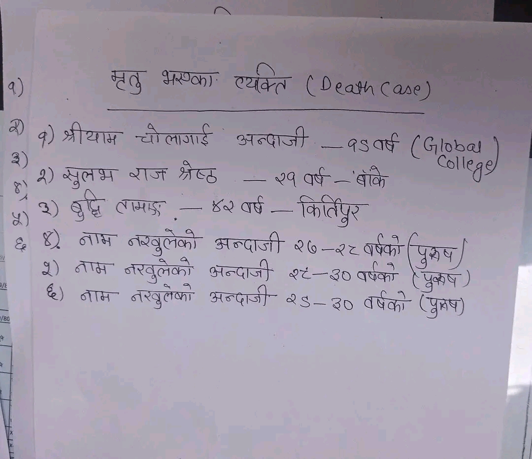 मृतकहरू मध्ये एक जना कीर्तिपुर निवासी ४२ वर्षीय युवा पनि रहेको बताइएको छ । उनको महांकालस्थानस्थित ट्रमा सेन्टरमा मृत्यु भएको हो ।