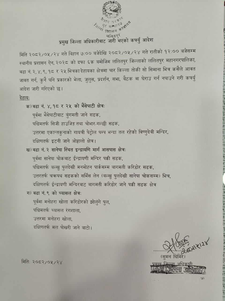 बिहान ७ बजेदेखि रातिको १२ बजेसम्मका लागि स्थानीय प्रशासन ऐन, २०८८ को दफा ६ को बमोजिम ललितपुर जिल्लाको विभिन्न स्थानमा कर्फ्यु लगाइएको हो ।