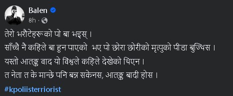 जेनजी समूहले सोमबार गरेको देशव्यापी आन्दोलनमा १९ जनाको ज्यान गएपछि बालेनले सामाजिक सञ्जालमा स्टाटस राख्दै प्रधानमन्त्री ओलीलाई ‘आतंकवादी’को संज्ञा दिएका छन् ।