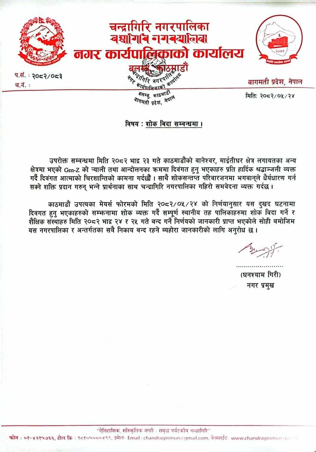 मंगलबार सूचना जारी गरेर नगरले विकसित पछिल्लो घटनाप्रति दुःख व्यक्त गर्दै भदाै २४ र २५ (मंगलबार र बुधबार) का दिन नगर क्षेत्रका सबै शैक्षिक संस्था बन्द रहने जनाएको हो ।