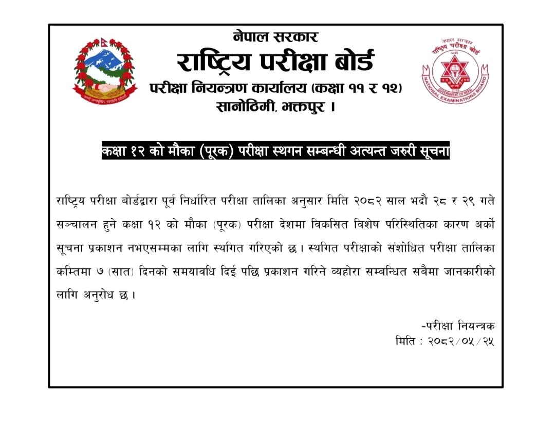 बुधबार राष्ट्रिय परीक्षा बोर्डले एक सूचना जारी गर्दै यही भदौ २८ र २९ गते हुन लागेको कक्षा १२ को मौका परीक्षा स्थगित भएको जनाकारी दिएको हो ।