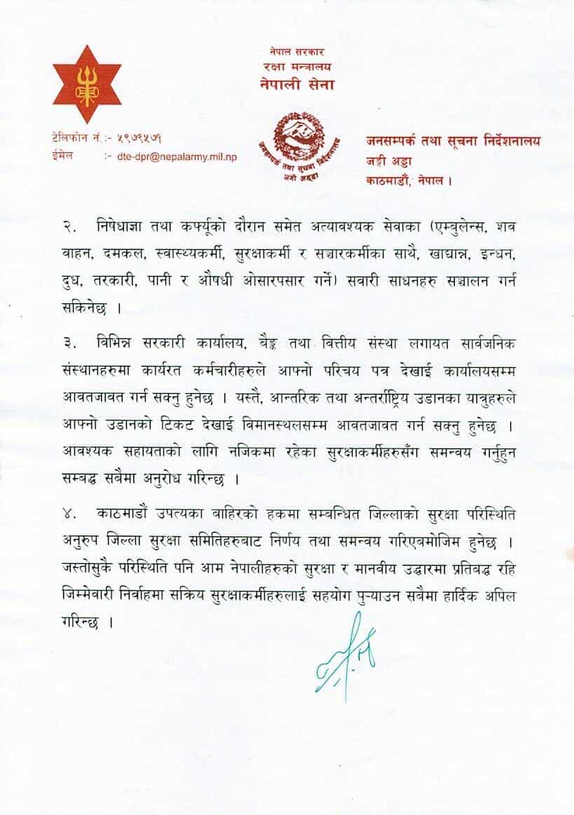 अत्यावश्यक कार्यका लागि २६ गते बिहान ६ बजेदेखि बिहान १० बजेसम्म र बेलुका ५ बजेदेखि ७ बजेसम्म आवतजावत गर्न पाइने समय तोकिएको नेपाली सेनाले जनाएको छ ।