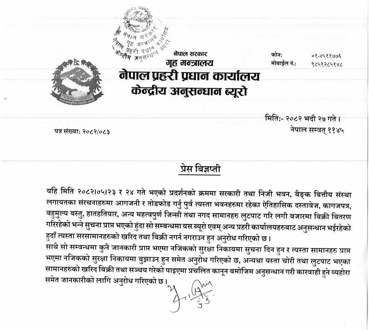 ब्यूरोले शुक्रबार एक प्रेस विज्ञप्ति जारी गर्दै प्रदर्शनका क्रममा सरकारी तथा निजी भवन, बैंक तथा वित्तीय संस्थाहरूमा आगजनी र तोडफोड गर्नुअघि त्यहाँबाट ऐतिहासिक दस्तावेज, बहुमूल्य वस्तु, नगद, र अन्य महत्त्वपूर्ण जिन्सी सामान लुटपाट भएको सूचना प्राप्त भएको जनाएको छ।