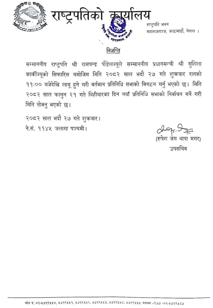 अन्तरिम सरकारकी नवनियुक्त प्रधानमन्त्री सुशीला कार्कीको सिफारिसमा हिजो (२०८२ साल भदौ २७ गते शुक्रवार) राति ११ बजेदेखि लागू हुने गरी राष्ट्रपति पौडेले प्रतिनिधि सभा विघटन गरेका हुन् ।
