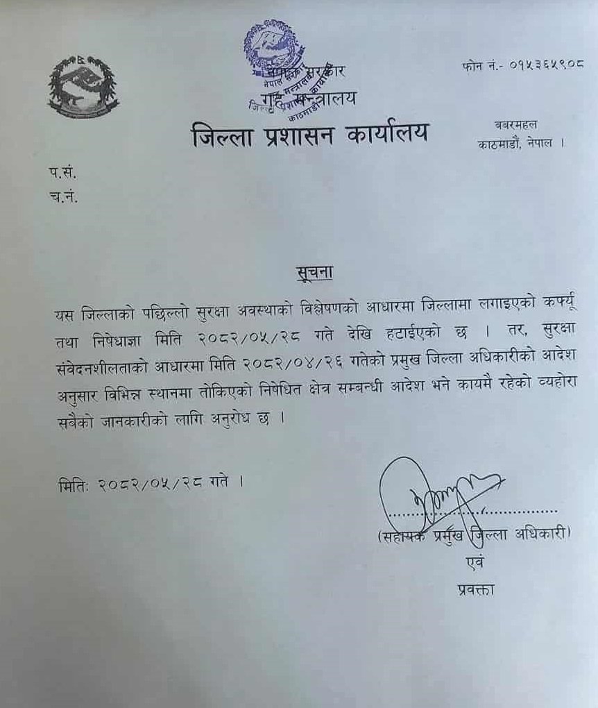 जिल्ला प्रशासन कार्यालय काठमाडौंले जिल्लाभर लगाइएको कफ्र्यु र निषेधाज्ञा हटाउने निर्णय गरेको छ ।