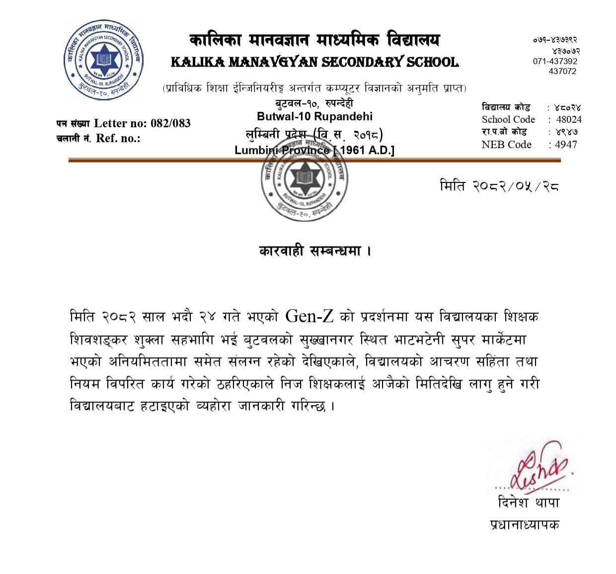 बुटवलको कालिका मानवज्ञान माविमा पढाउने शिक्षक शिवशंकर शुक्लाले आन्दोलनका नाममा भाटभटेनी सुपर मार्केटको लुटपाटमा संलग्न भएपछि विद्यालयले उनलाई जागिरबाट बर्खास्त गरेको हो ।