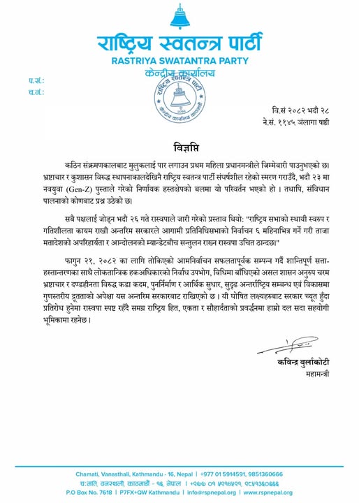 महामन्त्री कविन्द्र बुर्लाकोटीद्वारा जारी गरिएको विज्ञप्तिमा रास्वपाले आफ्नो स्थापनाकालदेखि नै भ्रष्टाचार र कुशासनविरुद्ध संघर्षशील रहेको स्मरण गराएको छ । पार्टीले यसअघि भदौ २६ गते जारी गरेको प्रस्तावमाथि पनि जोड दिएको छ ।