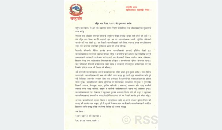 बालबालिकाको संरक्षण, विकास र सहभागिताका लागि आआफ्नोतर्फबाट भूमिका निर्वाह गर्न सम्बद्ध सबै पक्षको ध्यानाकृष्ट हुनेछ भन्ने विश्वासका साथ यस दिवसले बालबालिकाहरूको सर्वांगीण विकासका लागि सम्बद्ध सबैमा थप प्रेरणा मिलोस् भन्ने कामना राष्ट्रपति पौडेलले व्यक्त गरेका छन् ।