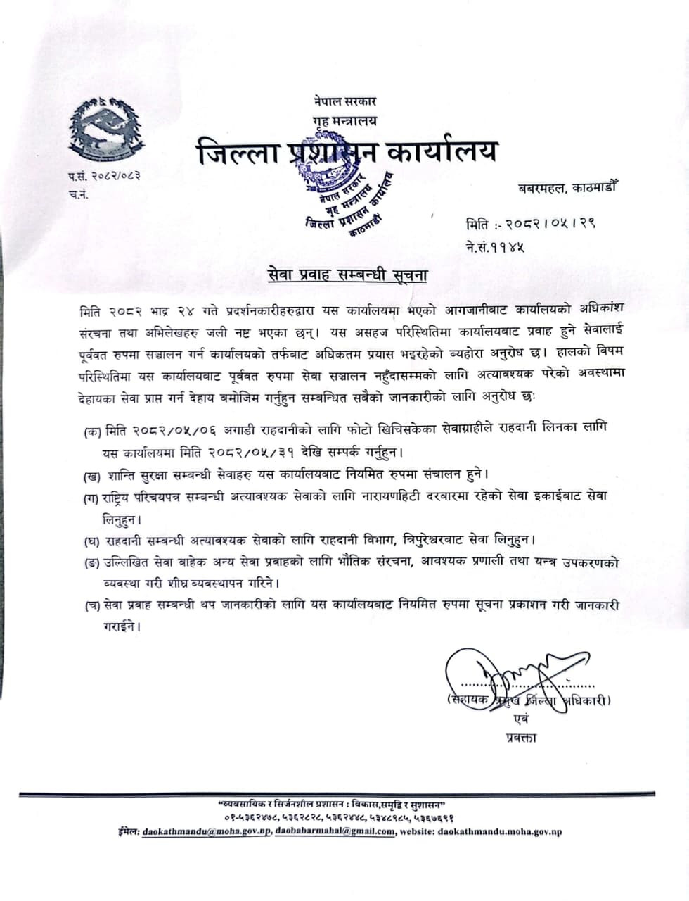 जिल्ला प्रशासन कार्यालय काठमाडौंमा आगजनी र तोडफोड भएपछि सो कार्यालयबाट हुने सेवा लिनका लागि विभिन्न कार्यालय तोकिएको छ ।