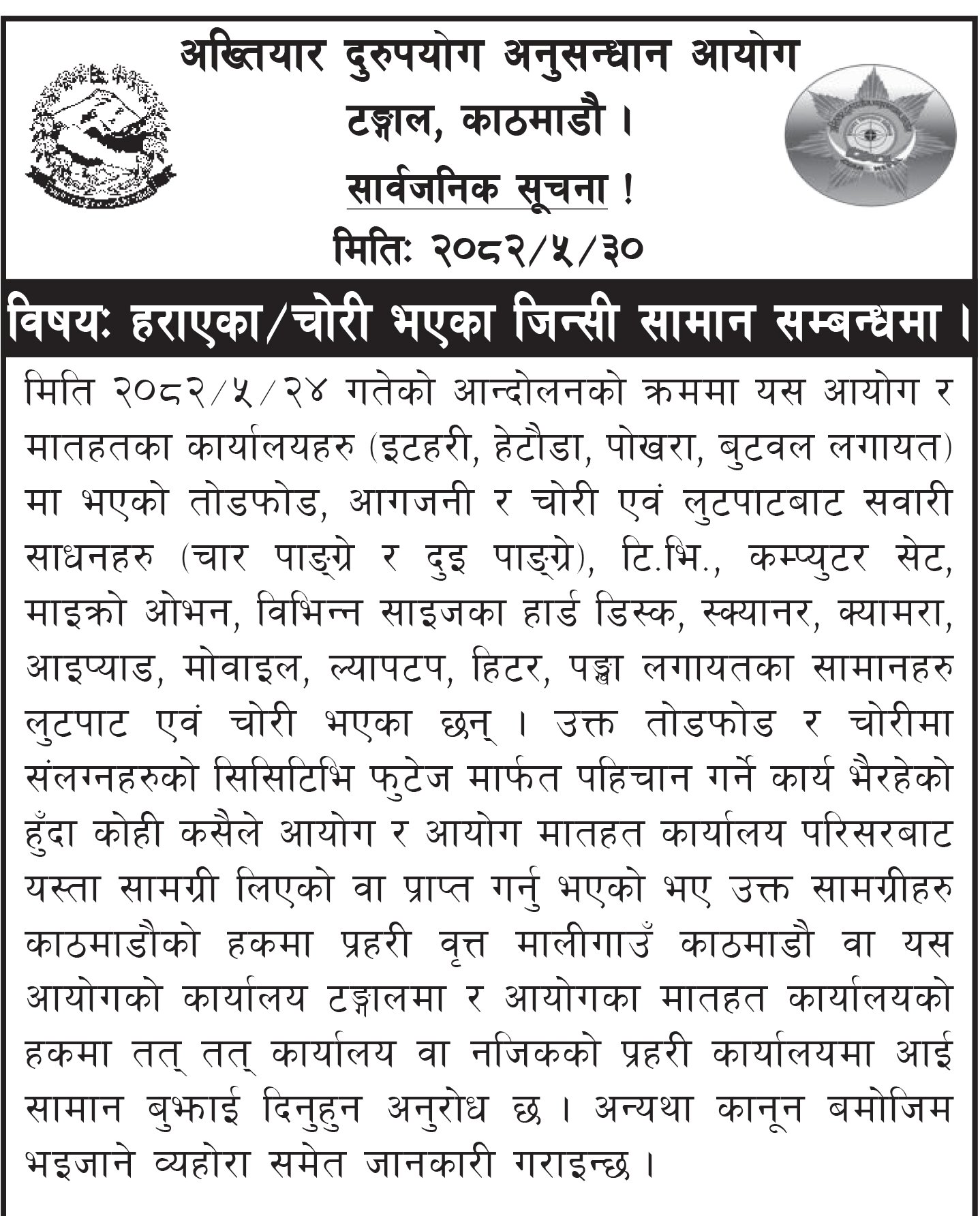 अख्तियार दुरुपयोग अनुसन्धान आयोगले भदौ २४ गतेको आन्दोलनका क्रममा आफ्ना कार्यालयहरूबाट चोरी भएका सामग्रीहरू फिर्ता गर्न सोमबार एक सार्वजनिक सूचना जारी गरेको छ।