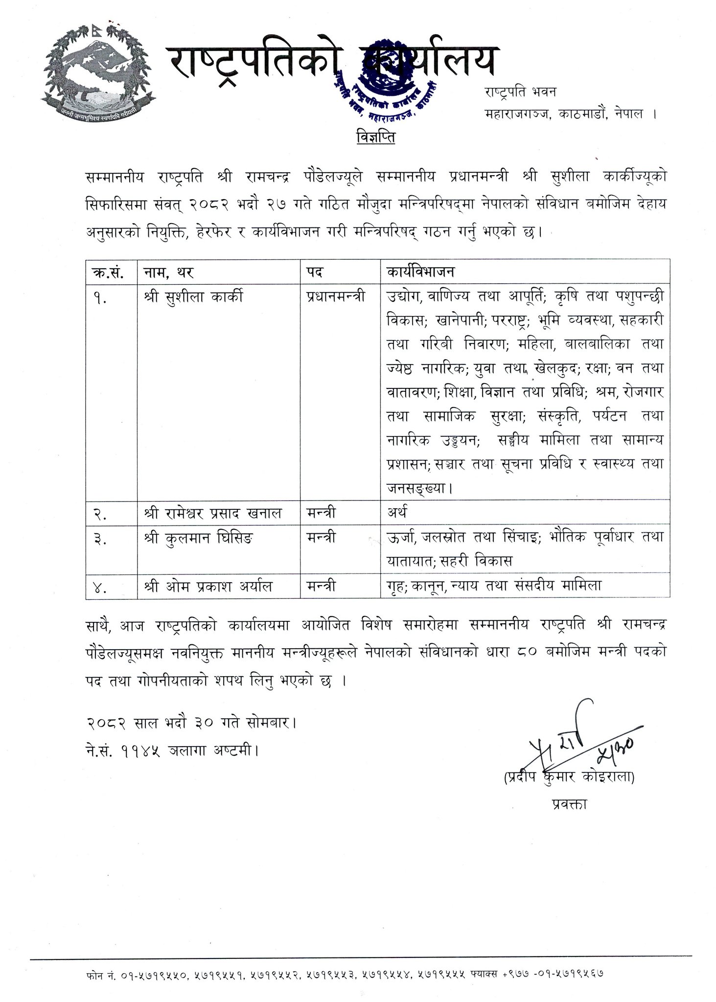 प्रधानमन्त्री सुशीला कार्कीको उपस्थितिमा राष्ट्रपति रामचन्द्र पौडेलले उनीहरूलाई शपथ गराएका हुन् ।